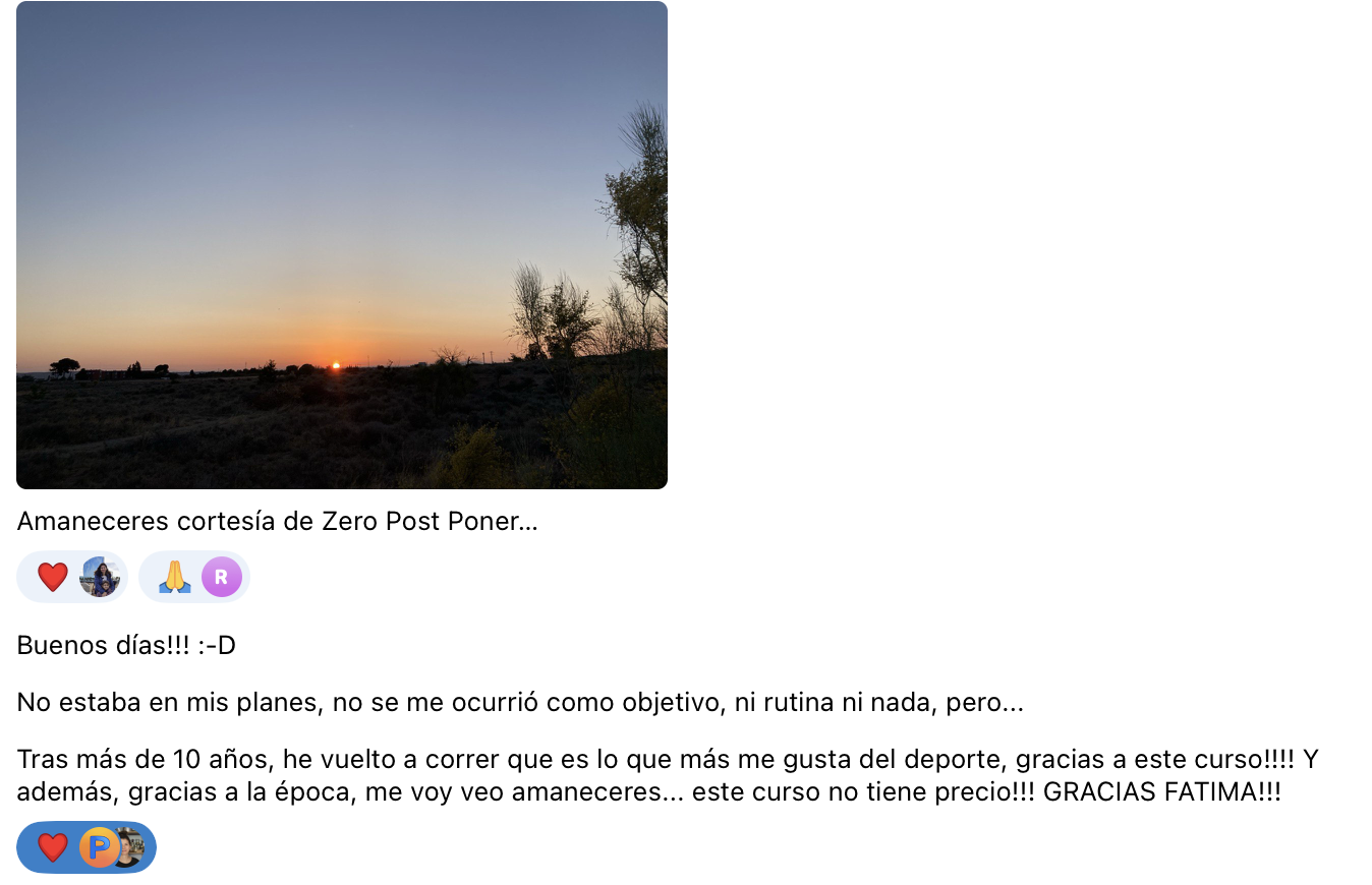 - Te suenan frases como “es que a mi la fuerza no se me da” o “el deporte no es lo mío”, "correr es de cobardes"... hay que probar porque quizás tengamos creencias que necesitan ser salvadas. Hace un año no me atraía un carajo el Crossfit, hoy tengo agendado un hueco para ir a hacer una clase de prueba.